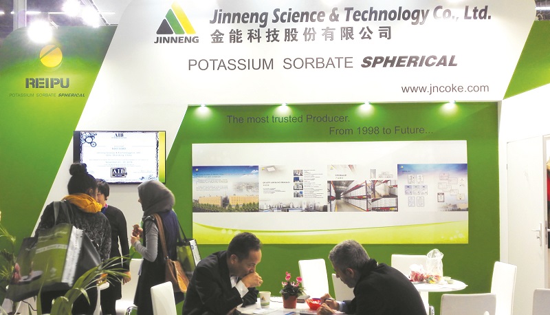 歐洲食品配料展會上,深含中國古典元素的公司布展吸引眾多客戶前來參觀洽談,好評如潮。(圖為業務人